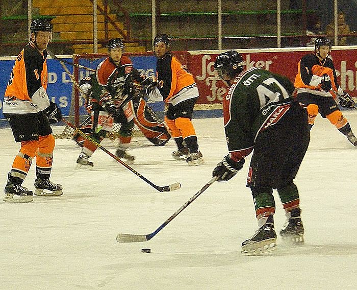 Aktuelle und ehemalige Braunlager unter sich: Der aktuelle Wölfe-Verteidiger Alois Öttl schießt, Andreas Bippus hat sich vor Torwart Eike Busch postiert. Die ehemaligen Harzer Mario Breneizeris, Bruno Kähm und Sven Eichler (orange, von links) stemmen sich gegen den Angriff