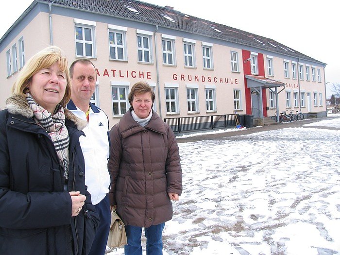 Von August bis Dezember des vorigen Jahres hatten Fachfirmen im Auftrag der Stadtverwaltung das Gebäude auf Vordermann gebracht. So können sich die die112 Schüler, die Lehrer und Schulleiter Uwe Chour (Mitte) über einen neuen Werk- und Computerraum freuen. Dank des neuen Sonnenschutzes heizen sich die Klassenräume nicht mehr auf, im Dachgeschoss sind neue Horträume entstanden inklusive einer Hortküche.