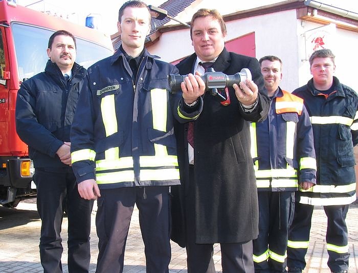 Ein neues Hohlstrahl-Rohr – gestiftet von Jens Niedergesäß (3.v.l.), dem General-Vertreter der Sparkassen-Versicherung in Nordhausen, – haben die beiden jetzt mit ihrem Sundhäuser Feuerwehrkameraden Nicky Hermann (rechts) und Nordhausens-Berufsfeuerwehr-Chef Gerd Jung (links) in Empfang genommen. Die Versicherung stiftete das Rohr im Rahmen des Programms Im Rahmen des Programms 1000 Hohlstrahlrohre für 1000 Feuerwehren.