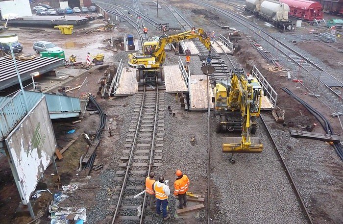 Die erste Etappe für die beiden neuen Behelfsbrücken, auf der größten Nordhäuser Baustelle in der Freiherr-vom-Stein-Straße, war am Sonntagnachmittag fast geschafft. An diesem Wochenende wurden die Brücken für die HSB-Gleise installiert...