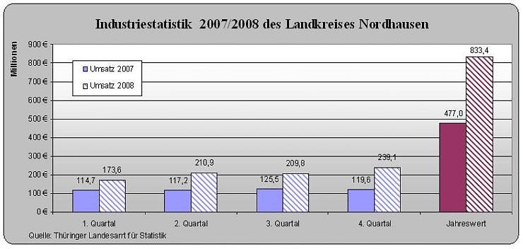 Autor: nnzDer Jahresumsatz unserer großen Industrieunternehmen in Stadt und Landkreis hat sich nahezu verdoppelt. Von 477 Millionen Euro Jahresumsatz im Jahr 2007 ist der Umsatz auf immerhin 833 Millionen Euro im Jahr 2008 angestiegen, erklärte Rinke die Zahlen. Besonders erfreulich sei, dass mit 711 Millionen Euro der größte Teil dieser Industrieproduktion direkt aus der Stadt Nordhausen komme.