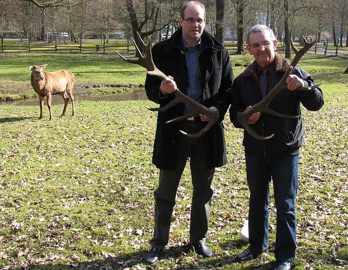 Nordhausens Bürgermeister Matthias Jendricke und sein Katzhütter Amtskollege Wilfried Machold mit dem Geweih von Hirsch Paul, der im Hintergrund zu sehen ist