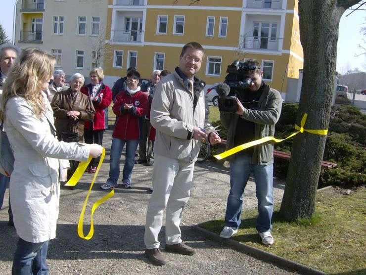 Kurz vor 11.00 Uhr trafen sich viele Bleicheröder bei herrlichem Sonnenschein vor dem Kulturhaus, um in Gegenwart des MDR den behindertengerechten Wanderweg für den Osterspaziergang freizugeben.