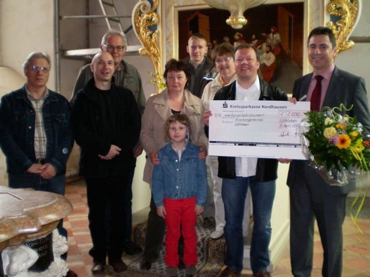 So übergab heute Vorstandsmitglied der Kreissparkasse Nordhausen Herr Wolfgang Asche einen Scheck über 2.500,- € an die Kirchenräte Frau Marga Lehmann, Herrn Frank Gerstenberger, Frau Dagmar Ullrich und Herrn Bernd Spangenberg als vorzeitige Osterüberraschung. Bürgermeister Fritz Lehmann, Gemeindepfarrer Holger Zschömitzsch und einige Gemeindeglieder ließen es sich nicht nehmen an der Übergabe teilzunehmen.