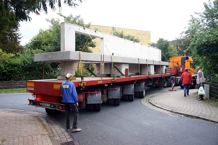 Am Heringer Standort der HABAU-Firmengruppe werden in der Regel emotionslose Betonfertigteile produziert. Doch es gibt natürlich Ausnahmen. Der Regel und der Ausnahme ist eines gleich: Beide müssen transportiert werden. Und das ist nicht immer so einfach...
