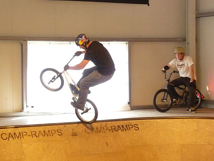 Beim Warmfahren hat kn schon mal die Kamera reingehalten. Und wenn man sagt deutscher Meister sagt, muss man auch wissen, dass er 2004 sogar Weltmeister war. Mit solchen Top-Promis ist die Skate-Halle natürlich ein echter Anziehungspunkt.