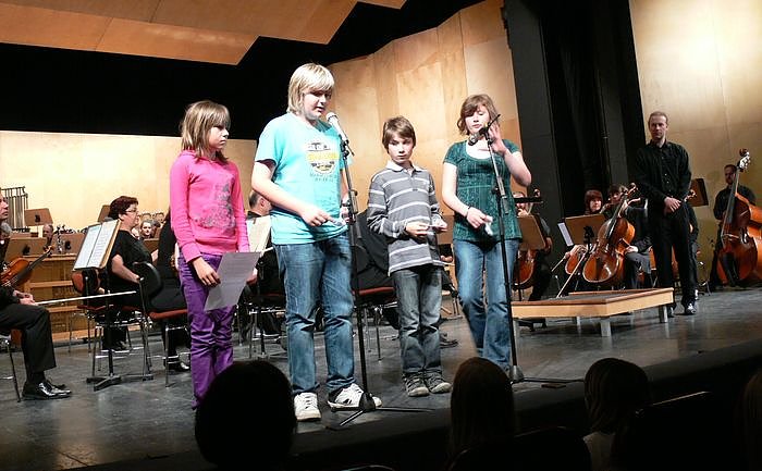Pit Uhden erklärte den jungen Besuchern der OrchesterWerkstatt auf sehr anschauliche Weise, wie sich die Stücke inhaltlich zusammensetzen, so dass die Mädchen und Jungen die einzelnen Titel exakt verfolgen konnten. Dementsprechend aufmerksam lauschten sie auch der OrchesterWerkstatt.