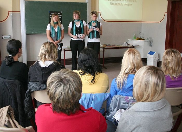 Die Abiturientinnen Lisa Grimm, Sandra Kleinewalter und Annabel Zöller stellten ihre Seminarfacharbeit vor, in der sie sich mit Formen, Ursachen und Folgen von Gewalt an Kindern in Deutschland auseinandergesetzt haben. In einem multimedialen Vortrag stellten sie gestern den Zuhörern nicht nur die recherchierten Fakten vor, sondern forderten auch auf, gegen diese Problematik gesamtgesellschaftlich vorzugehen.