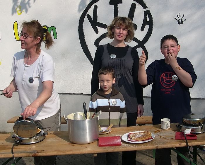 Wer vom Schmökern Hunger oder Durst bekommt, wird von Kindern und Eltern bestens mit selbstgebackenen Waffeln Kaffee und Apfelsaft versorgt. Der Erlös der Aktion wird für die Arbeit des KILA dringend benötigt. Ferienfreizeiten, Aktionstage und regelmäßige Gruppenprogramme lassen sich ohne die Einnahmen durch den Bücherhandel kaum zu finanzieren.