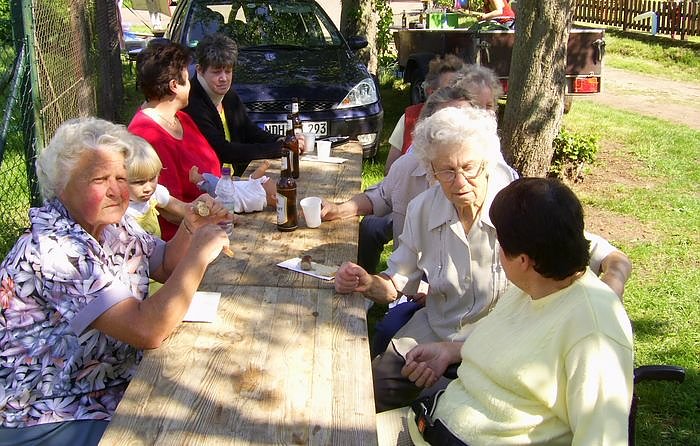 Gegenüber sitzen bei sommerlichen Temperaturen ältere Frauen und Männer mit Kindern zwischen 1 bis 14 Jahren an Tischen oder Spielgeräten beisammen, trinken Limo und schwatzen. Heute jährt sich die Eröffnung des Kinderspielplatzes in Osterode zum ersten Mal. Grund genug daraus ein jährliches Kinderfest zu machen.