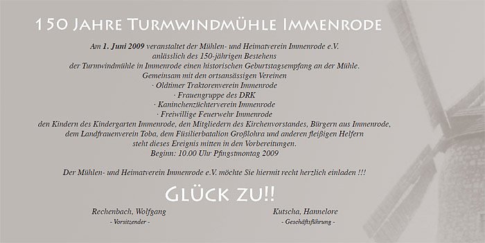 Am Pfingstmontag den 1.6.2009 ist es soweit. Nach Monaten der Vorbereitung aller Vereine von Immenrode kann der historische Geburtstagsempfang an der Immenröder Mühle (Archivfoto aus 2008) starten.
