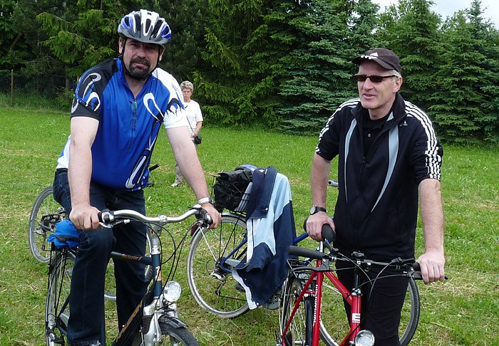 Der sportlich sehr vielseitige Gerold Wucherpfennig (re.) mit Sondershausens Bürgermeister Joachim Kreyer vor der Fahrt mit vielen weiteren Radlern aus Nordhausen und Sondershausen vom Mühlentag in Immenrode über Straußberg zum Frauenberg bei Sondershausen.