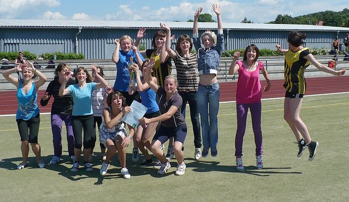 ... dem 1. Platz in diesem Finale belohnt. Die Mannschaft setze sich mit einem Vorsprung von 382 Punkten (Gesamtpunktzahl: 6104) gegen das Gymnasium Großengottern durch. Den 3. Platz belegt sie HSG Sömmerda. Mit dem Sieg in ihrer Altersklasse sicherten sich die Mädchen die Teilnahme am Landesfinale in Ohrdruf, das am 16. Juni stattfinden wird.