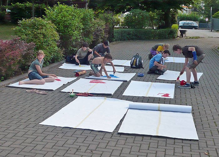 T-Shirts wurden mit aufwendigen und topmodischen Prints versehen. Ein ganz besonderes Angebot war die Gestaltung von Körperbildern. Im Rahmen des Bundesprogramm VIELFALT TUT GUT konnten die Kinder hierbei lernen, dass es Dinge gibt, die alle Menschen auf der Welt verbinden und ebenso Dinge, in denen jeder ein bisschen unterschiedlich ist. Mit viel bunter Farbe und Spaß beim Klecksen wurde jedem Umriss des eigenen Körpers Leben eingehaucht. Natürlich kam auch das Lesen nicht zu kurz. In spannende Detektivgeschichten oder Tagebuchstories konnte je nach Lust immer wieder hinein geschmökert werden. Eigene Lesevorlieben aber auch -abneigungen wurden ausgiebig ausgetauscht.