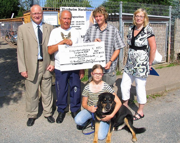150 Euro für das Nordhäuser Tierheim gespendet haben die Mitglieder des Nordhäuser Vereins für Deutsche Schäferhunde Karl Siese. Tierheimleiterin Cornelia Knust nahm heute den Scheck vom Vereinsvorsitzenden Hartmut Kühn entgegen und vom Hundetrainer des Vereins, Walter Herzberg.