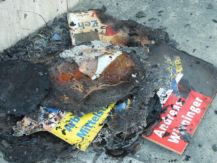 Gegen 4.40 Uhr hatten fünf bis sechs – vorwiegend jugendliche Unbekannte – sechs Wahlplakate der SPD, CDU und FDP zusammengetragen und im Bereich der Verbbindung zwischen Töpferstraße und Weberstraße angezündet. Als die Besatzung eines Streifenwagens der Polizei das Treiben bemerkten, flüchteten die Jugendlichen.