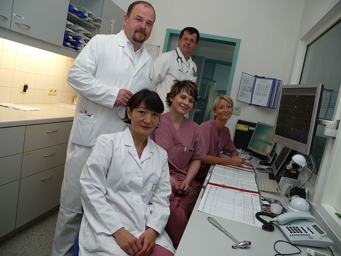 Autor: nnz/knSitzend, von links: die Assistenzärztin Rosa Drüke sowie Schwestern Sandra Fiedler und Sabine Krauel, dahinter stehend: Chefarzt Dr. Ulrich Erdmann (links) und Oberarzt Robert Rejmus