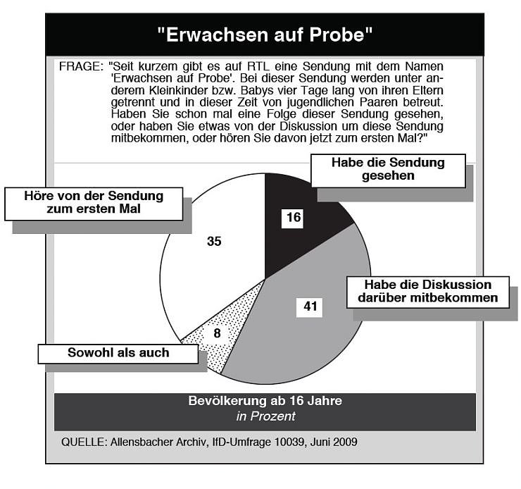 Anfang Juni strahlte RTL die erste von sieben Folgen seiner Doku-Show "Erwachsen auf Probe" aus. Schon im Vorfeld der Sendereihe gab es heftige Proteste von Kinderschützern, Therapeutenverbänden und besorgten Bürgern. Was die Deutschen davon halten, das wollten die Allensbacher Demoskopen genauer wissen...