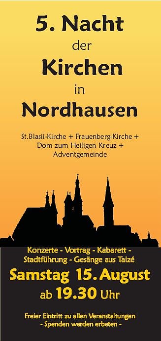 Am Abend und in der Nacht von Samstag auf Sonntag stehen die Türen aller Nordhäuser Kirchen weit geöffnet. Bevor die einzelnen Kirchen und Gemeinden mit unterschiedlichsten Angeboten und Programmen beginnen, startet um 19.30 Uhr am Petersberg-Turm erstmalig eine "musikalische Stadtführung"...