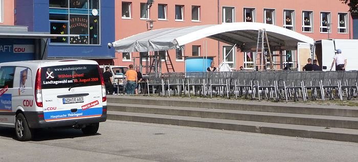 Die Stühle sind aufgereiht, die Bühne wird aufgebaut. Auch ein Extra-Plakat zur Begrüßung hat CDU-Kreisgeschäftsführer Maik Schröter anfertigen lassen. Die Techniker sind mit dem Bühnenaufbau beschäftigt, die Beamten des Bundeskriminalamtes führen Absprachen. Gegen 14 Uhr werden Hunde das Gelände nach Sprengstoff absuchen und dann kann die Party beginnen. Die nnz wird natürlich auch darüber berichten...