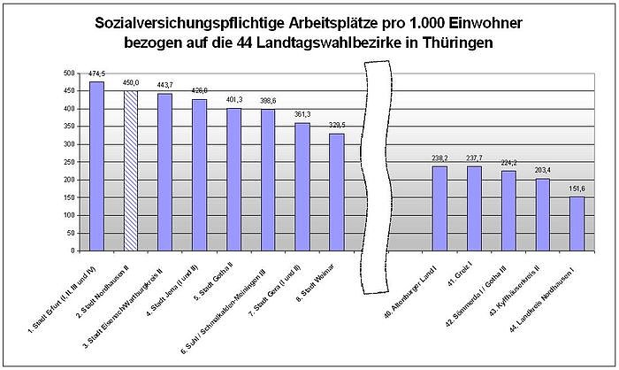 Autor: nnzSo kommen in der Rolandstadt 450 sozialversicherungspflichtige Arbeitsplätze auf 1.000 Einwohner – Erfurt hält mit 474 Arbeitsplätzen die Spitze im Land. Dass wir sogar noch vor Eisenach, Gotha und Jena liegen, hat uns schon überrascht, erklärte der Nordhäuser Bürgermeister Matthias Jendricke dazu.