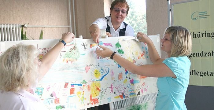 Autor: nnzMarie-Luise Kardach und Sybille Reiche vom Jugendzahnärztlichen Dienst des Gesundheitsamtes, hinter der Wand ist Anke Heidecke, Prophylaxeschwester der Landesarbeitsgemeinschaft Jugendzahnpflege Thüringen e.V.
