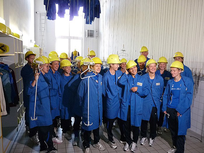 Bevor es uns Bergwerk ging, hieß es sich erst mal richtig auszurüsten. Auch die Damen durften auf den schicken knitterfreien Hut nicht verzichten. Und auch später mussten sie sich, wie alle Besucher, die kurze Belehrung über den Selbstretter anhören. Denn auch bei Prominenten gilt, Sicherheit geht vor.