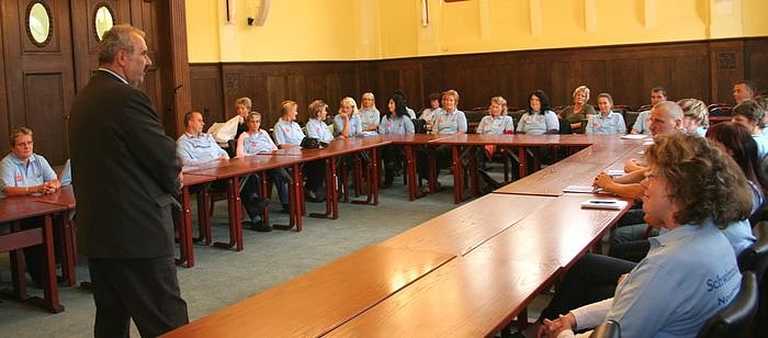 Der Landkreis Nordhausen setzt sich dafür ein, dass die Kinder besser schwimmen können und widmet dem obligatorischen Schwimmunterricht viel Aufmerksamkeit. Landrat Joachim Claus, die 2. Beigeordnete Loni Grünwald, der Koordinator des Schulschwimmens des Landes Thüringen, Werner Hütcher, und Sebastian Gräser von der Sparkasse Nordhausen übergaben heute Nachmittag den Schwimmlehrern T-Shirt mit dem neu entworfenen Logo für den Schulsport.