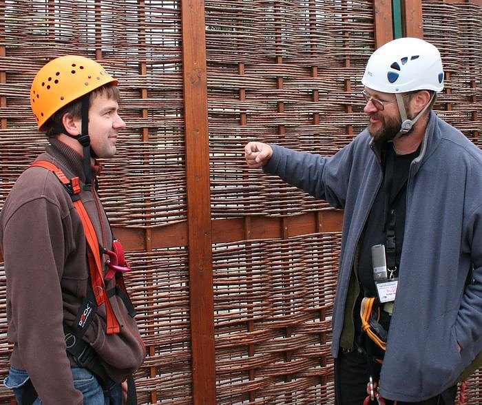 Die jungen Männer haben in der Lebenshilfe-Werkstatt einen Weidenzaun als Sichtschutz für den Hochseilgarten gebaut. Dafür hat Rüdiger Neitzke vom Mobilé-Team die Gruppe heute in die Kletteranlage eingeladen. Die Jungs waren gleich begeistert und wollten am liebsten gleich an dem Tag hoch, als wir den Zaun hier aufgebaut haben, erinnert sich Andreas Zaake. Es macht total Spaß, die Jungs zu sehen, wie sie sich gegenseitig sichern und anfeuern, findet Rüdiger Neitzke. Solche Geschäfte machen doch Sinn. Ich finde die Idee gut, Leistung gegen Leistung zu tauschen, ohne dass immer der eine den anderen bezahlt. Das ist ähnlich wie beim Tauschhandel im Mittelalter.