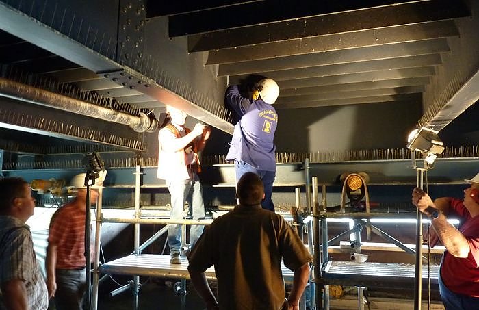 Nach einem Pilotprojekt für die DB- AG wurde 2009 auch die erste Straßenbrücke mit diesem Verfahren durch die Fachleute der Schachtbau Nordhausen GmbH saniert. Sie überspannt den Rhein bei Karlsruhe-Maxau. Bauleiter Andreas Hentrich berichtet: Von Juni bis Oktober haben unsere Mitarbeiter die 450 Meter lange Brückenkonstruktion an 650 Schweißstellen nachbehandelt, zuvor waren hier kleine Risse saniert worden.