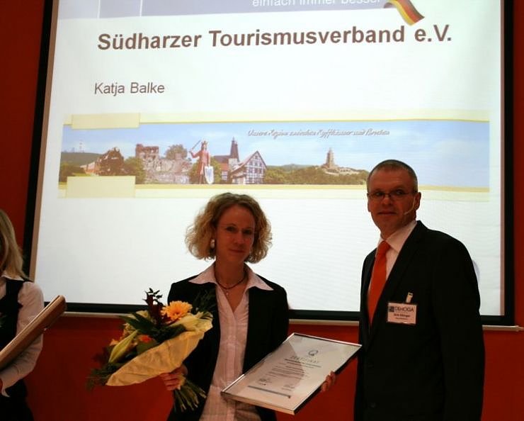 Auf der Internationalen Fachmesse für Gastronomie, Hotellerie und Gemeinschaftsverpflegung GÄSTE 2009 in Leipzig überreichte Dirk Ellinger, Geschäftsführer des DEHOGA Thüringen e.V. das Qualitätssiegel an Katja Balke, Mitarbeiterin und Qualitätscoach des Südharzer Tourismusverbandes e.V., die sich sehr über die Bewertung freute.