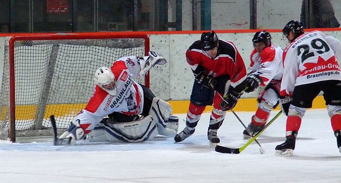Autor: nnzSzene aus dem Hinspiel bei FASS Berlin: Wölfe-Goalie Mario D'Antuono sowie die Verteidiger Alois Öttl und Sven Eichler versuchen, FASS-Kapitän Lucien Aicher am Torabschluss zu hindern
