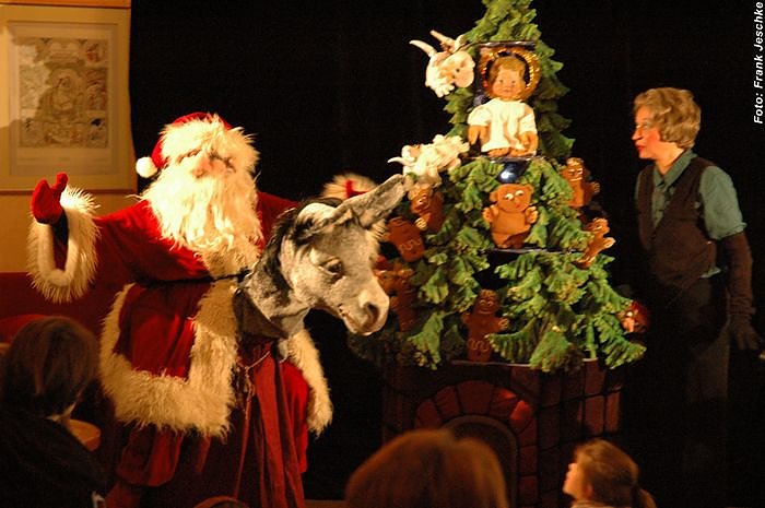 Tatyana Khodorenko und Sybille König spielten die beiden Nachbarinnen, die für eine Weihnachtsfeier Pfefferkuchen backen und sich dabei die Geschichte vom Pfefferkuchen-Männchen erzählten: Eigentlich sollten es nur zwölf Männchen werden, aber aus einem Teigrest ist noch ein dreizehntes entstanden, nicht so schön wie die anderen und auch ohne Glasur. Die Kinder Paula und Anna warfen es einfach aus dem Korb, der ihnen auf dem Wege zur Weihnachtsfeier zu schwer geworden war. Nun war das Pfefferkuchenmännchen ganz allein und es drohten ihm viele Gefahren...Ein altes Märchen aus Schlesien, gespielt in einer Weihnachtspyramide in der Form eines Tannenbaumes. Die drei Ebenen entsprechen dem Vorbild mittelalterlicher Bühnen, auf denen in den Kirchen Himmel, Erde und Hölle dargestellt wurden. Diese Geschichte greift die fast vergessene Tradition des Christkinds und seines Helfers Knecht Ruprecht, wieder auf. Abgesehen von der Tatsache, dass sich selbst die Erwachsenen in den Bann dieser Geschichte ziehen ließen, war es interessant die Kinder zu beobachten.