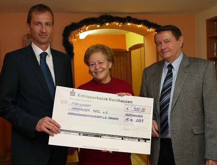 Autor: nnzGroße Freude herrschte heute in den Geschäftsräumen der Nordhäuser Tafel. Wir im vergangenen Jahr, so will auch in diesem Jahr die Wohnungsbaugenossenschaft eG "Südharz" (WBG) die soziale Einrichtung kurz vor Weihnachten mit einer finanziellen Zuwendung erfreuen. Die WBG-Vorstandsmitglieder Hans-Werner Grimm (rechts) und Sven Dörmann (links) überreichten am heutigen Vormittag an die Leiterin der Tafel, Helga Rathnau (Mitte), den symbolischen Scheck in Höhe von 500 Euro.