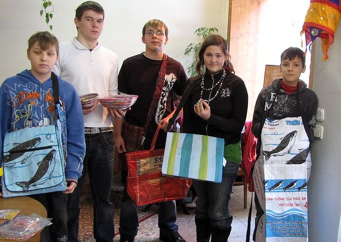 Die Kinder der Förderschule kamen mit Frau Fallay in den Weltladen, ließen sich von den Reli-Schülern in einer improvisierten Vorschau einige Produkte präsentieren und nahmen sie mit – ohne zu bezahlen. Als verkäufliche Leihgaben finden sie Verwendung beim Schulfasching unter dem erwähnten Motto "RECYCLING".