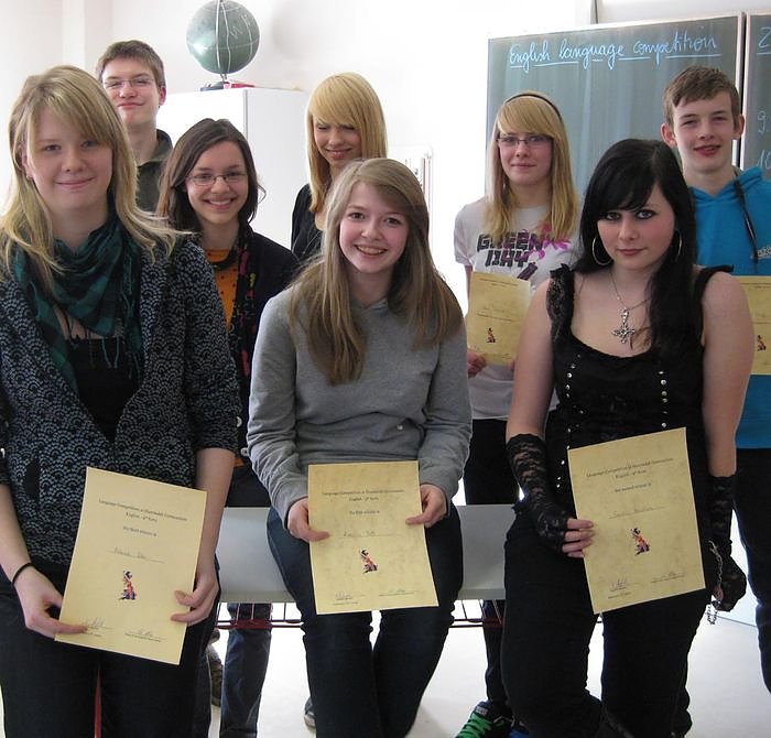 Beim Englischwettbewerb der 9. Klassen am Humboldtgymnasium in diesem Monat gingen die acht besten Schüler der Jahrgangsstufe mit großer Motivation an den Start. Nach einem vierstündigen Wissenstest belegten dann Katharina Balk, Sandra Hanstein und Rebecca Peter die Plätze 1- 3 und konnten sich über Urkunden und Buchpreise des Buchhauses Rose freuen. Im April werden sie das Humboldtgymnasium beim Regionalwettbewerb vertreten.