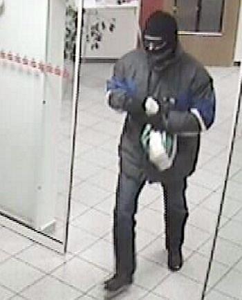 Während der tat war er mit einer schwarzen Sturmhaube maskiert und trug zusätzlich eine Sonnenbrille und darüber wahrscheinlich eine Skibrille. Es kann nicht ausgeschlossen werden, dass er auf der Flucht Teile seiner Maskierung verloren oder weggeworfen hat.