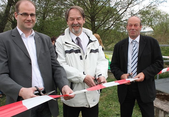 Landrat Joachim Claus, Bürgermeister Matthias Jendricke und Andreas Heise, Vorsitzender des Vereins Karstwanderweg Landkreis Nordhausen e.V., schnitten am Wehr in Obersalza das Band durch.
