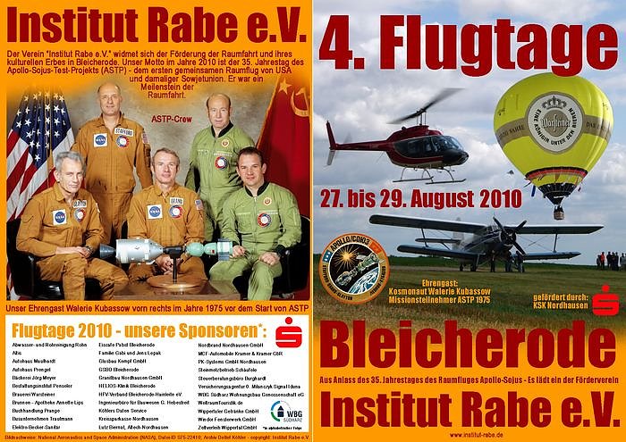 Die Mitglieder des Fördervereins planen nun bereits die 4. Bleicheröder Flugtage vom 25. bis 29.08.2010 mit dem Thema: Internationale Weltraumfahrt – 35. Jahrestag des gemeinsamen Fluges von Sojus und Apollo. Dazu eröffnete sich im Rahmen der alljährlichen Raumfahrt-Tagung in Neubrandenburg die Möglichkeit, einen der Teilnehmer an dieser Mission, Valeri Kubassow, einladen zu können, der auch sogleich seine Zusage gab. Ein solcher Gast bzw. Referent würde – wie im Falle von Dr. Sigmund Jähn – die Tagung nicht nur bereichern, sondern auf eine angemessene Ebene stellen und zudem ein großes Publikum mobilisieren, da das Interesse an der Raumfahrt immens groß ist, wie die Erfahrungen zeigen.