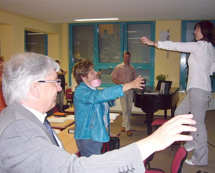 Mit gutem Beispiel voran. Die Nordthüringer Schulleiter beim Üben eines Koordinationsprogrammes