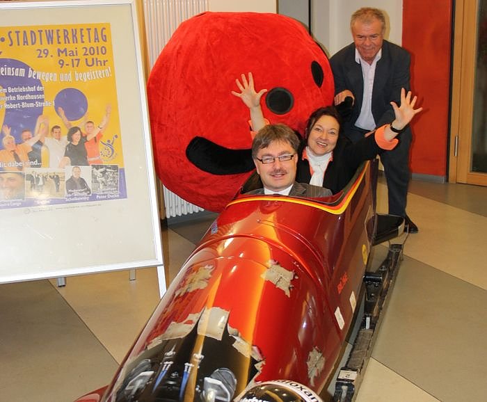 Autor: nnzIm Zweierbob aus Oberhof hatten am Donnerstag die Geschäftsführer der Verkehrsbetriebe und der Stadtwerke Nordhausen, Gabriele Schuchardt und Mathias Hartung, Platz genommen. Arndt Forberger (Geschäftsführer der Stadtwirtschaft) und der Badehaus-Baddel hatten wohl die meiste Kraft und versuchten sich als Anschieber.