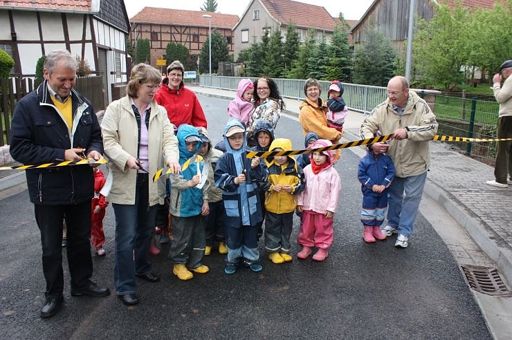Die Brücke über den Herreder Bach freigegeben nach neunmonatiger Bauzeit haben heute morgen Nordhausens Bau- und Wirtschaftsdezernentin Inge Klaan (vorn Mitte/CDU)), Herredens Ortsbürgermeister Wolfgang Becker (vorn rechts) und Herbert Leineweber (vorn links) von der Bau ausführenden Firma aus Worbis. Nachdem anfangs keine Firma den Umbau vornehmen wollte, hatte schließlich in der zweiten Ausschreibungsrunde einzig die Firma TMB Worbis ein Angebot abgegeben und den Zuschlag erhalten.