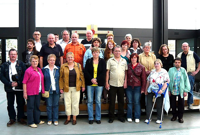 Im Anschluss daran wurden eine angeregte Diskussion und Erfahrungsaustausch geführt. Der Erfahrungsaustausch wurde auch bei Kaffee und Kuchen weitergeführt. Zum Abschluss hatten die Teilnehmer Gelegenheit, an einer fachkundigen Führung im Kloster teilzunehmen. Frau Ortrun Iser, Studienleiterin im Europäischen Jugendbildungszentrum informierte uns über die Anfänge des Kloster vor 879 Jahren. Damals hatten Zisterziensermönche aus dem Kloster Kamp am Niederrhein begonnen aus der Wildnis fruchtbares Ackerland zu gewinnen und das Kloster zu errichten. Vor 485 Jahren im Bauernkrieg zerstört, begannen vor 20 Jahren einige Einwohner von Volkenroda mit dem Wiederaufbau der Kirche und des Klosters. Seit 1994 ist die Jesusbruderschaft als tragende Gemeinschaft vor Ort. Der Christus-Pavillon ist eine moderne Kirche mit einer hervorragenden Akustik. Frau Iser berichtete uns auch von dem Jugendbildungszentrum, vom Schulbauernhof, Gästehaus, Cafe und Klosterladen. Gastfreundschaft und Gastfreiheit wird im Kloster Volkenroda großgeschrieben.