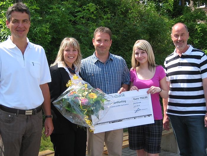 Die Volksbank – vertreten durch Melanie Arend, eine Absolventin des Gymnasiums Bleicherode – zeigte sich dafür mit einem Scheck über 750 Euro erkenntlich. Die Spende wurde vom Schulleiter Gerhard Siemenroth, seinem Stellvertreter Thomas Gaßmann, dem Vorsitzenden des Schulfördervereins, Sven Luther sowie der Schülersprecherin Jenny Stiller erfreut entgegengenommen.
