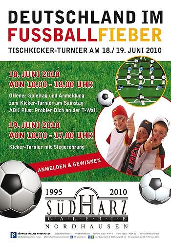 Darüber hinaus kann man sich am Freitag für das Tischkickerturnier am Samstag (19. Juni) anmelden und am Samstag Preise aus den Geschäften der Südharz-Galerie gewinnen. Am Samstag wird dann von 10.00 - 17.00 Uhr um den Sieg gekickert. Es gibt unter anderem einen WM Fußball von sport treff zu gewinnen, Armbanduhren von Uhren Pfrenzinger, Fanpakete von C&A und viele Gutscheine aus den Geschäften des Shopping-Tempels.