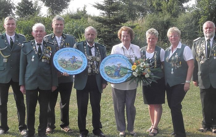 Bei bestem Wetter wurden Uschi Volmer (5. v.l.) Schützenkönigin und Jürgen Werkmeister (4. v.l.) Schützenkönig. In Vertretung des erkrankten Hans-Günther Hendrich übergab der zweite Vorsitzende der Nordhäuser Schützenkompanie, Volker Kohl, die begehrten Ehrenscheiben.