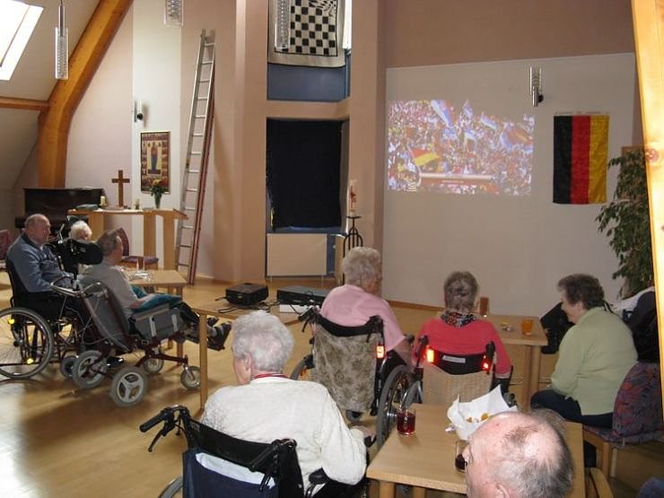Voller Emotionen, mitfiebernd, erfreut, enttäuscht, mit Vuvuzeela und Fanschal- so sahen die letzten vier Wochen rund 20 Bewohner des Seniorenheimes alle Spiele der deutschen Mannschaft. Die Kapelle der diakonischen Einrichtung wurde kurzerhand zum Event- Center. Mit Beamer und Lautsprecheranlage hatte man fast ein Stadion- Feeling.