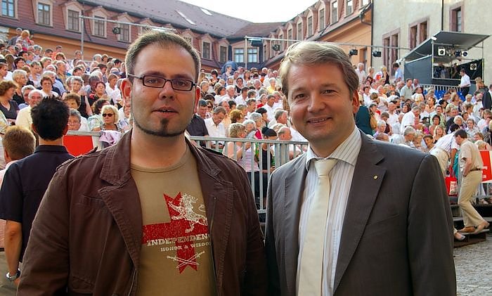 Das Bild zeigt Regisseur Toni Burkhardt (li.) und Intendant Lars Tietje vor der ausverkauften Zuschauertribüne im Schlosshof Sondershausen