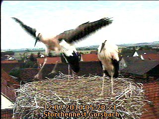 Autor: nnzManchmal sind sie auch so übermutig, das sie ganz knapp noch auf dem Nestrand wieder landen. Die Storcheneltern müssen sich dann einen anderen Platz zum Verweilen suchen, z.B. auf den Häuserdächern im Ort. Etwa eine Woche braucht es noch, bis die Jungstörche flügge sind und dann werden sie auch das erste Mal selber auf Nahrungssuche gehen.