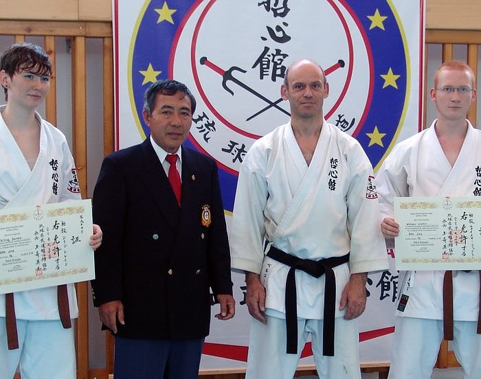 Trotz dieser vielen Höhepunkte gelang zwei Nordhäusern noch ein Sahnehäubchen. Dorren Schilling und Viktor Vollmer bestanden am letzten Tag die Prüfung zum 1. Dan (Schwarzgurt)! Diese Prüfung kann nur beim Stiloberhaupt selbst abgelegt werden, zweiter Prüfer war hier der Vorsitzende des Karate-Do-Kwai Nordhausen, Frank Pelny, der auch als technischer Direktor des RYÛKYÛ KOBUDÔ TESSHINKAN KYÔ KAI für Europa fungiert.